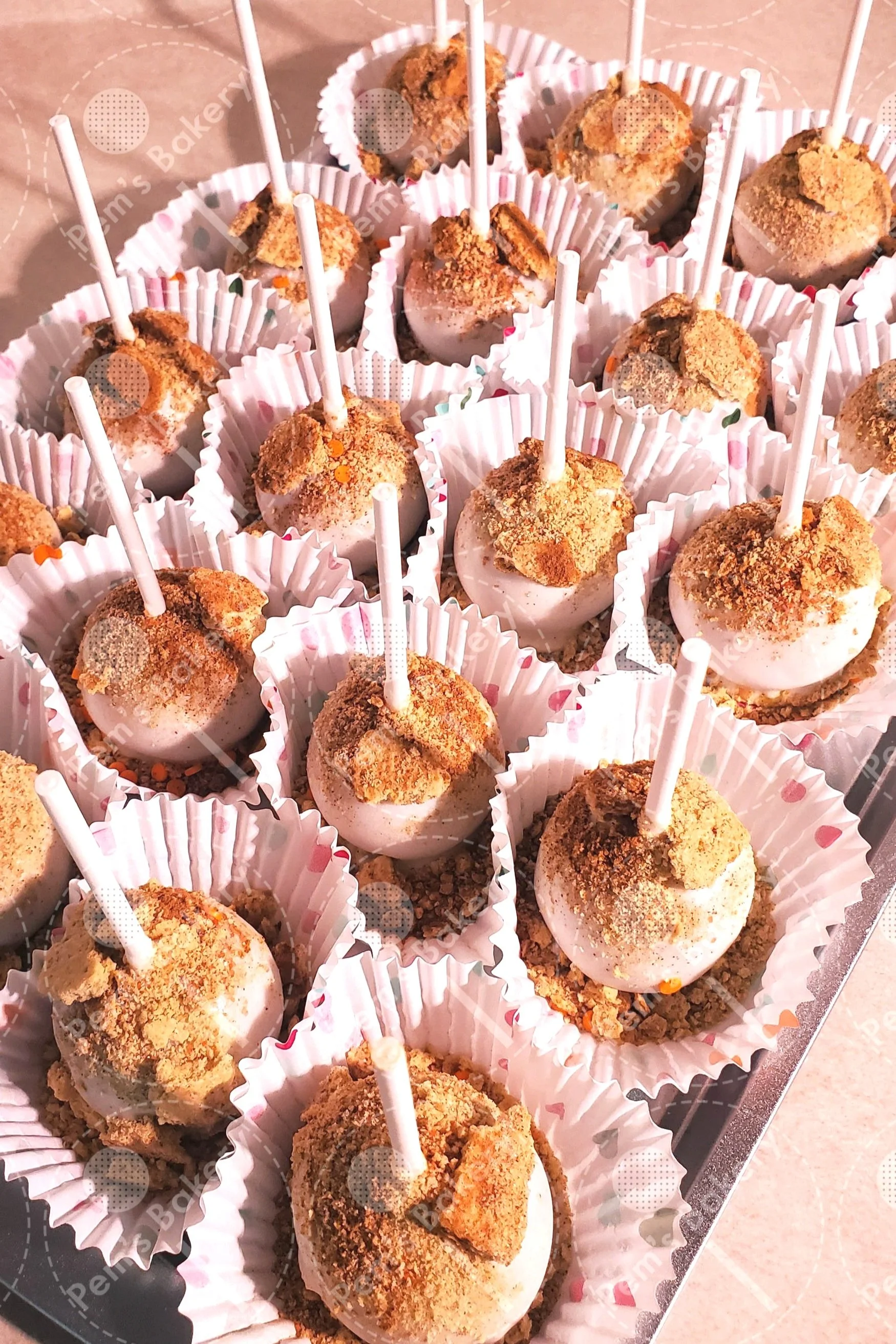 A campfire classic! Velvety Vanilla Cake & Chocolate Coating with Graham Cracker Crumble & Mini Marshmallow topping!